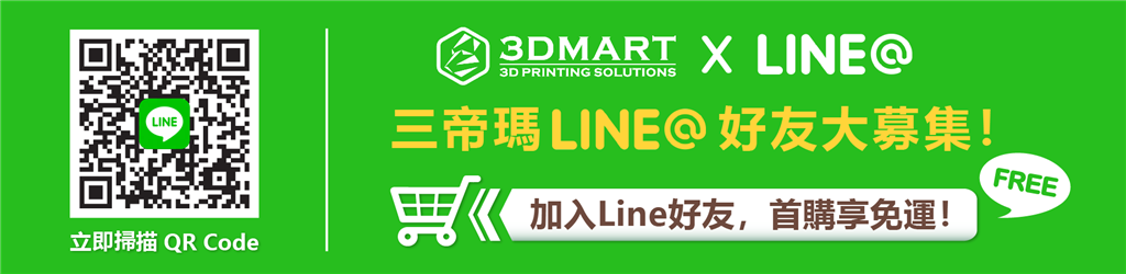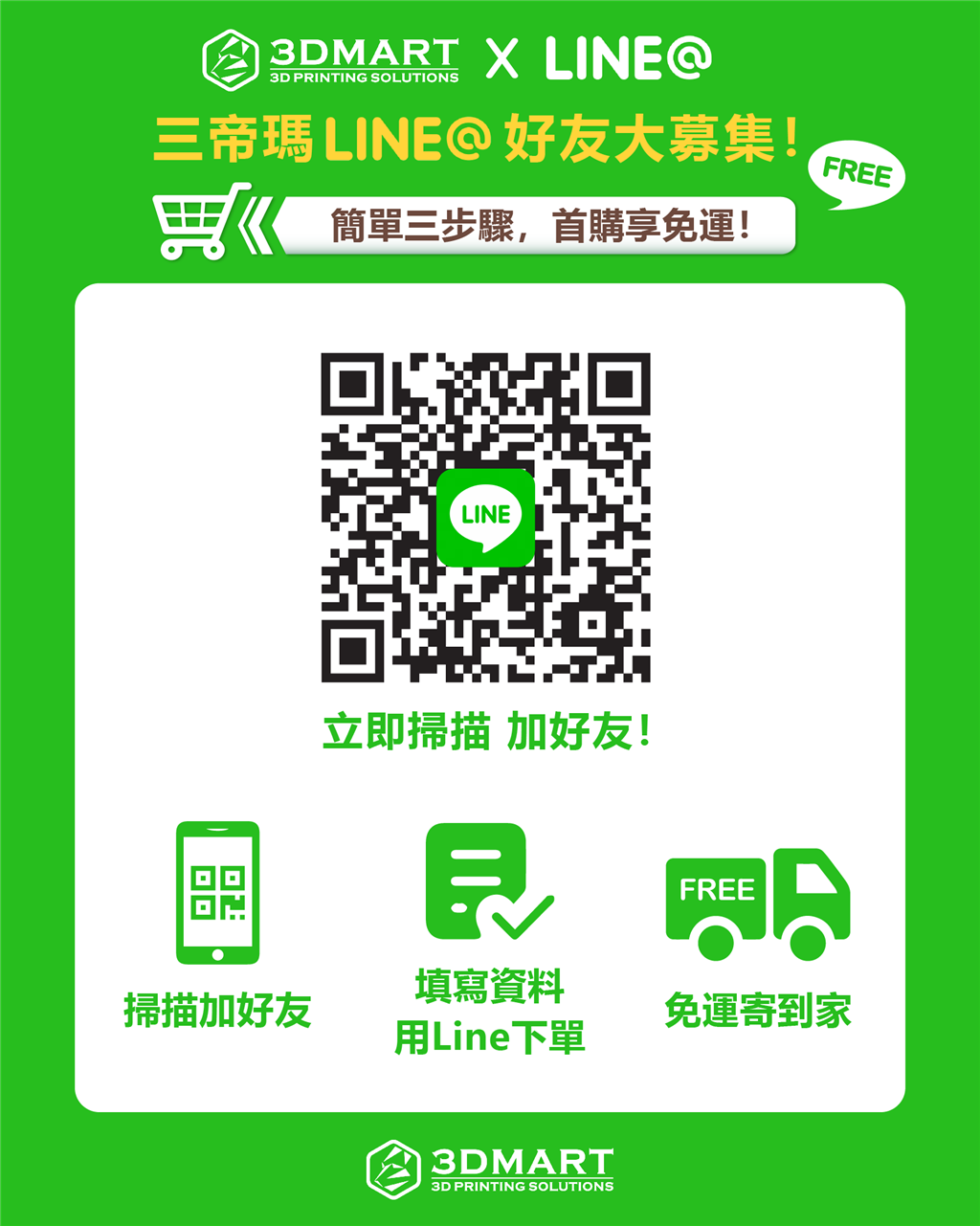 【3D列印優(yōu)惠】官方帳號上線啦!好友首購享免運! 三帝瑪現(xiàn)在也有官方Line帳號,讓商城購物更方便囉!快來加入3D列印生活圈,好友首次購物即享免運優(yōu)惠,3D列印線材、樹脂、配件通通有!快來加入Line好友! 好康只要三步驟!活動辦法帶你看: 1.掃描QR Code,加入官方Line好友。 2.輸入姓名、e-mail及電話(此為訂單及聯(lián)絡(luò)憑證,敬請確實填寫),用Line傳送商城購物內(nèi)容。 3.享受免運優(yōu)惠,等待商品寄到家! *三帝瑪公司保留所有活動最終變更權(quán)利。 *注意事項:本活動僅適用於商城購物內(nèi)容;不包含代印服務(wù)、掃描服務(wù)及技術(shù)支援,以上服務(wù)仍需進入官網(wǎng)系統(tǒng)才可成立訂單。 .代印服務(wù)點我 .掃描服務(wù)點我 .技術(shù)支援點我 追蹤粉絲專頁、抓住3D技術(shù):https://www.facebook.com/www.yztcys.cn/