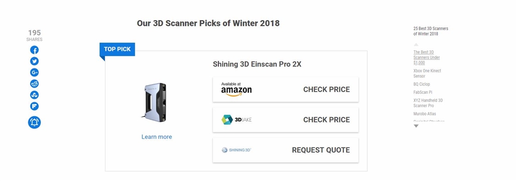 【3D掃描工程】All3DP全球最佳3D掃描器首選:EinScan Pro 2X All3DP是世界領(lǐng)先的3D列印雜誌,內(nèi)容引人入勝且無論對於初學者或熟練的老手都有幫助;除了3D列印相關(guān)的教育和娛樂訊息外,更經(jīng)常發(fā)佈具有公信力的全球3D列印產(chǎn)品評比。 EinScan Pro 2X也在剛結(jié)束的2018年冬季獲選為25種全球最佳3D掃描器指南的首選(比較內(nèi)容包含性價比),在Ultimaker S5獲選為All3DP的2018秋季最佳雙噴頭3D列印機之後;再度證實了三帝瑪為顧客挑選3D列印產(chǎn)品的品質(zhì)。 (圖片來源:All3DP網(wǎng)站2018冬季25款全球最佳3D掃描器評比) 現(xiàn)在就帶各位看這款最佳3D掃描器的使用方式及詳細功能有哪些: .EinScan Pro系列技術(shù) EinScan Pro系列採用白光3D掃描技術(shù)來達成高精度和高速度,這種專業(yè)級系統(tǒng)可以利用良好的顏色紋理捕捉小至0. 03mm大至4米的物體;EinScan Pro 2X為該系列最新的手持式3D掃描器,更適用於中、小型物體,能在不犧牲精度的前提下完成高速3D掃描。 .四種3D掃描模式 EinScan Pro 2X提供手持式快速掃描、手持式高精度掃描和固定掃描模式(再分為搭配轉(zhuǎn)盤與否)。以搭配自動轉(zhuǎn)盤的做法使用EinScan Pro 2X進行手持式快速掃描,能快速捕捉雕像的立體3D圖檔,還可直接透過3D列印製造出另一個實體。 .兩種手持掃描模式 手持掃描分為快速或高精度模式,在快速掃描模式下,EinScan Pro 2X每秒可處理高達1,500,000點(30 fps)的速度;相比之下高精度掃描較慢,但能提供更無可挑剔的掃描精度,最高可達0.05毫米。 這兩種手持模式都可以透過在掃描物體上貼定位貼紙來提高準確度,讓最小點距離縮小為0.2mm,進而運算出高分辨率的3D數(shù)位成像。 .新系列升級版 同時發(fā)布的EinScan Pro 2X Plus是升級版,主要為提高掃描速度和準確性,具有更高的單次掃描範圍、點距離和掃描距離。雖然兩個3D掃描器的掃描精度和景深相同,但相較於基本的2X型號更適用於研究、設(shè)計藝術(shù)和文化遺產(chǎn)、工程和醫(yī)療保健等應(yīng)用。 前一版的EinScan Pro系列當然也是非常好的選擇,也依然列在這25種最佳3D掃描器的名單裡,只是新出的Pro 2X更加超越舊版的名次。 EinScan-Pro +也是多功能的3D掃描器,可以捕捉大、小物體,總體而論,適合多用途的3D掃描情況,EinScan Pro 2X系列則更適合專業(yè)級的使用。 不愧是評選最佳的3D掃描器是不是很強大呢?如果各位有看過我們之前使用EinScan Pro Plus完成的掃描文章(延伸閱讀:逆向工程實測,怪獸與牠們的模型!),可以發(fā)現(xiàn)它的精度非常細緻完整,而新一代的EinScan Pro 2X系列功能又更加強大。另外我們除了提供掃描服務(wù),而近期我們也會發(fā)佈相關(guān)實測,歡迎持續(xù)關(guān)注三帝瑪?shù)牡谝皇窒ⅲ?br /> 追蹤粉絲專頁、抓住3D技術(shù):https://www.facebook.com/www.yztcys.cn/