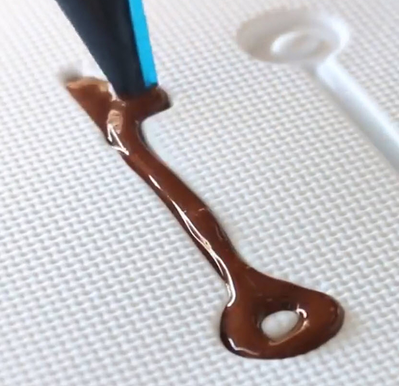 在模板上鋪一層巧克力醬,並在凝固後拆下,客製化造型鎖頭就完成了!小編看到這裡,還想到另一種延伸應(yīng)用,使用相同的方法也可以依照喜好,做出各種造型的蛋糕灑粉板,撒上巧克力、抹茶、黑糖粉,隨心所欲點(diǎn)綴你的創(chuàng)意點(diǎn)心。