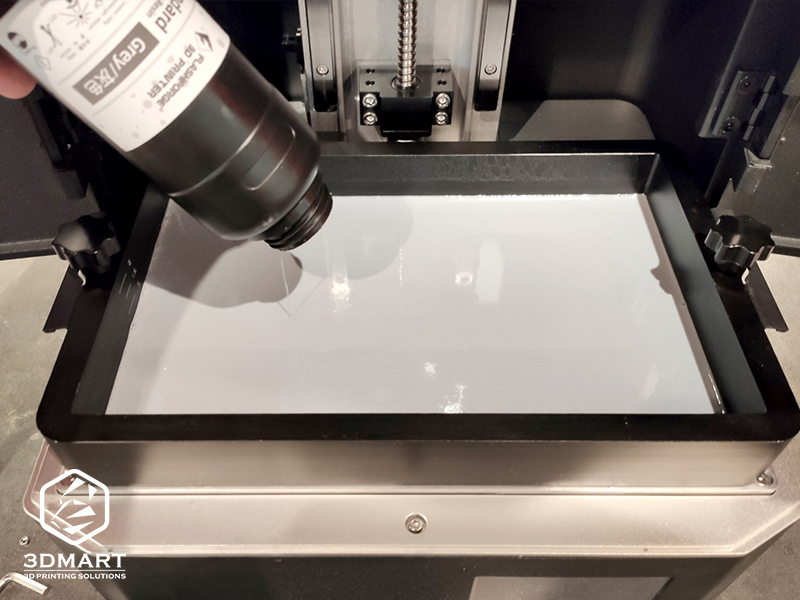 接下來(lái),搖晃光敏樹(shù)脂並倒入樹(shù)脂槽,樹(shù)脂量可依照樹(shù)脂槽內(nèi)的標(biāo)記線為主,最後將3D列印機(jī)的遮蔽光門關(guān)上。