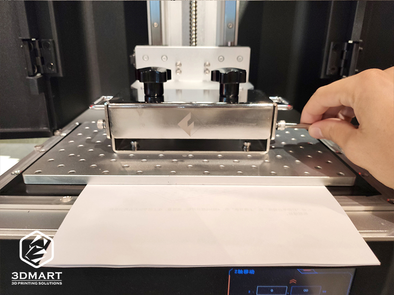 完全貼平底部紙張、LCD面板後,將載臺(tái)的固定螺絲重新鎖緊,來(lái)回抽動(dòng)三張紙,以能夠抽動(dòng),但有一些阻力為標(biāo)準(zhǔn),最後點(diǎn)擊螢?zāi)簧系摹缸罡摺?,平臺(tái)會(huì)再次上升至頂部,完成Z軸校正。