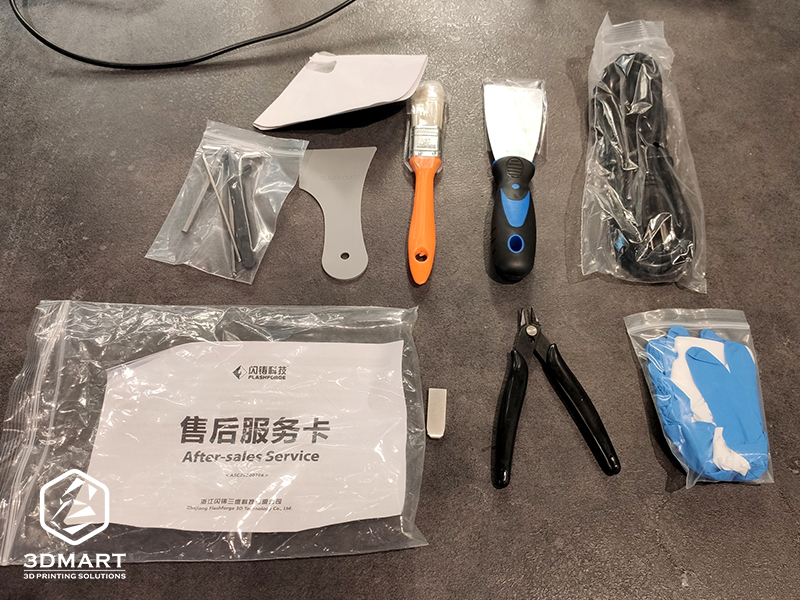 首先,將Flashforge Foto13.3光固化3D列印機(jī)拆箱取出,左右側(cè)開(kāi)式的拉門打開(kāi),可將機(jī)器內(nèi)密閉空間完全展開(kāi),再鬆開(kāi)列印載臺(tái)上方的固定轉(zhuǎn)軸,將中間的海綿塊取出,可見(jiàn)內(nèi)附配備齊全工具箱、樹(shù)脂材料。