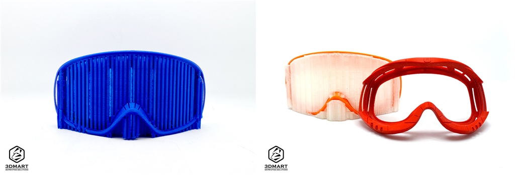 好處是這對於大面積的結(jié)構(gòu)影響不大、拆除也算方便,例如圖中的滑雪鏡框就可以用單噴頭系統(tǒng)製作懸空部分,不過表面的光滑度及美觀性會(huì)不如雙噴頭3D列印系統(tǒng)的表現(xiàn)。