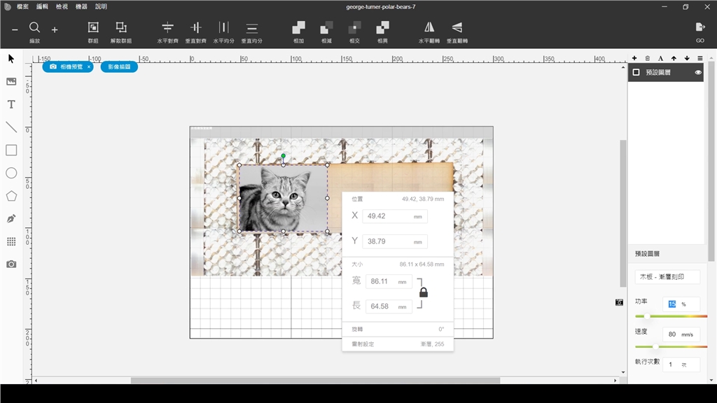 雷射雕刻前使用FLUX專用的編輯軟體Beam Studio,匯入物件後可以調(diào)整大小、設(shè)定座標(biāo)、旋轉(zhuǎn)、對(duì)齊…等多功能,「雷射設(shè)定」中也能依照需求選擇開(kāi)啟漸層模式、設(shè)定曝光數(shù)值。