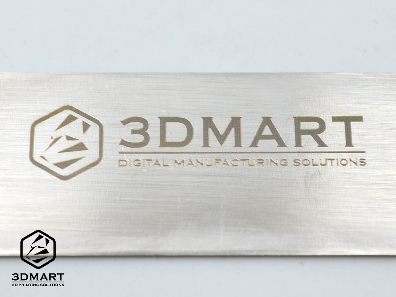 使用鐵製量尺進行金屬打標,雕刻3DMart Logo圖樣(尺寸:40 x 15mm),僅需3秒時間即可完成金屬雕刻,下方「Digital Manufaturing Solutions」小字,單字尺寸僅1mm,仍然有精細、高精度的雕刻效果。