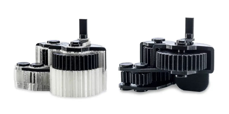 舒伯特公司(Gerhard Schubert GmbH)是頂載式包裝機(jī)「TLM技術(shù)」的先驅(qū)(點(diǎn)我看),生產(chǎn)許多自動(dòng)化設(shè)備,常會(huì)需要可以組合、可動(dòng)的工業(yè)零件,這類型的物件都會(huì)有較複雜的結(jié)構(gòu),同時(shí)對(duì)精度的要求也很高;以下這款可動(dòng)的零件來說,結(jié)構(gòu)上有四個(gè)螺絲、連動(dòng)的輪軸,透過雙噴頭系統(tǒng)一次3D列印完成。
