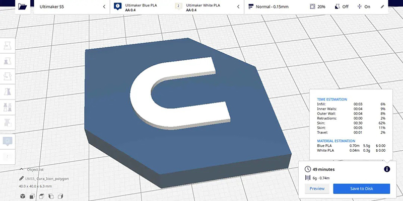 在開(kāi)始3D列印前,使用者需先在Ultimaker Cura切片軟體中,依照需求設(shè)定模型細(xì)節(jié)參數(shù),再將切片完成的3D檔案,以WiFi網(wǎng)路上傳至Ultimaker Digital Library,遠(yuǎn)端啟動(dòng)Ultimaker 3D列印作業(yè)(也可選擇以USB上傳)。