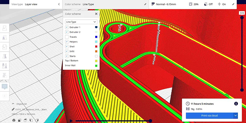 在Cura以往的版本中,選擇Preview預(yù)覽模式,可以點(diǎn)選切換至線型模式(Line Type),系統(tǒng)會(huì)依照填充、支撐,列印物件等不同結(jié)構(gòu),以不同顏色的線型來(lái)顯示;更新版本後,使用者不再需要手動(dòng)切換,線型預(yù)覽(Line Type)已成為預(yù)設(shè)模式,進(jìn)入介面即可一目瞭然。