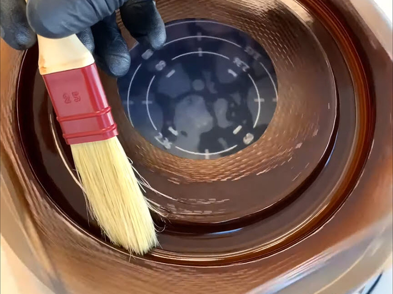 輪盤主體以木桌為架構(gòu),暗色透亮的咖啡色,恰好能用巧克力來表現(xiàn)!接著,呈現(xiàn)木頭上漆後光滑的小技巧,是在模具注入其他食材前,刷一層巧克力、油脂,再以食材進行填滿,如此可以更輕鬆脫模、不會沾黏模具,成品外觀也會更光滑完整。