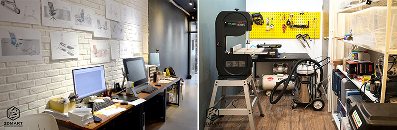 這個年輕的設(shè)計公司擁有各項加工設(shè)備,例如3D列印機、CNC、雷射切割機等,能直接內(nèi)部開發(fā)及製作樣品;走進辦公室,牆上貼滿了各式設(shè)計手稿,桌上也放著琳瑯滿目的專案模型。