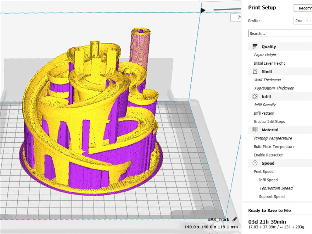 【3D列印應用】2018 Tapei Cycle最新展品:自動彈珠雲霄飛車! 三帝瑪即將參加10/31~11/3的自行車展囉!提醒大家趕快手刀看展拿贈品!這次的展覽除了三種技術的3D列印機以外,又有什麼新奇的東西呢?趕快一起來看看! 小時候大家都看過一些軌道玩具,當年很想要又沒有零用錢?現(xiàn)在有了3D列印機,要什麼都能自己做,還可以挑戰(zhàn)客製化超複雜雲霄飛車軌道!根據這個原理需要具備哪些東西呢?軌道本體、可往上升的螺旋軸、螺轉軸操控盤,以及額外的神祕嘉賓──慢速馬達。我們先來看看手動的成果: 這是怎麼做的呢?首先把檔案丟進Cura中分析軌道本體,可以自動判斷與生成支撐材料、並計算列印時間;畫面上可以看到預估列印時間大約需要三天多,實際列印時間也幾乎沒有差距。 全新的Cura 3.5擴充許多新功能,我們實際測試也感覺更好用,不但支援Ultimaker 以外的機種、新增多種材料和偏好設定,而且是免費的!想了解更多軟體細節(jié),可以參考我們之前分享的Cura 3.5介紹文章。 經過三天的3D列印終於完成雲霄飛車的軌道本體囉!這次使用的是Ultimaker 3 雙噴頭 3D列印機,並以主體PLA搭配PVA支撐列??;完成後直接將軌道本體放入水中,PVA就會自動溶解。懶人最愛的後處理方式,早已成為我們工程師的新寵,讓你打樣也能優(yōu)雅下班、不趕單、免催件! 溶解支撐材料大約需要一天的時間,搭配水箱打氣筒速度更加倍!是不是很像水族箱裡的造景裝置呢? 將其他零件也3D列印完成後,將圖右下角的操控盤和中間的卡榫互相結合,裝上最左邊的螺旋軸;關鍵控制組件也大功告成。 組合起來的效果讓人很滿意,連小編都玩得很開心,多虧Ultimaker 的列印品質,我們連彈珠都採用3D列印,旋轉控制盤彈珠就會一直跑軌道喔! 完成了嗎?工程師們還不滿足,最後自行改裝了馬達,讓彈珠軌道可以無限自轉。彈珠雲霄飛車是小時候最想擁有的玩具,趕快3D列印一臺個人專屬的吧! 各位工程師或Maker都可以自行設計更複雜的軌道版本玩玩看,接上馬達後非常療癒。10/31~11/3直接來世貿三館G0358a攤位找我們玩,不但可以在展場上看到它為你轉轉轉不停的身影,還可以免費拿精美好禮喔!我們的位置: 貼心提醒大家週年慶優(yōu)惠活動即將開跑、稍縱即逝,敬請把握機會! .好康一:Ultimaker 3D列印機九折購! 凡於11/05(一)到11/16(五)期間;購買Ultimaker 3D列印機(此優(yōu)惠不適用於刷卡系統(tǒng),若有需求還請電洽),期間內預付款全額付清,即可享有九折優(yōu)惠,Ultimaker同捆包內的列印機也同享九折! .好康二:Ultimaker原廠線材買五送一! Ultimaker原廠線材大特惠,優(yōu)惠期間買五送一,最高現(xiàn)省2490元(價低者折扣)!讓你的3D列印穩(wěn)定、好用、不心疼,等很久了嗎?要買要快趁現(xiàn)在,數量有限送完為止。 .同場加映:看展購機再送Ultimaker PLA線材一捲! 三帝瑪將同步於10/31(三)~11/03(六)在Taipei Cycle自行車展世貿三館展出!凡於活動期間內購買Ultimaker 3D列印機並造訪我們的攤位G0358a,即可再送您原廠PLA線材一捲。 最新消息都在我們的粉絲專頁,現(xiàn)在就追蹤、消息不漏接! 粉絲專頁:https://www.facebook.com/www.yztcys.cn/ 檔案來源:https://www.thingiverse.com/thing:1385312