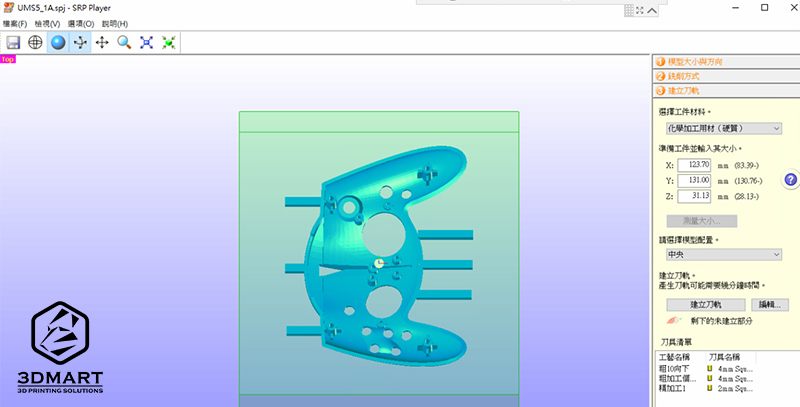 我們採用之前3D列印過的遊戲把手做樣品測試,Roland作為CNC設(shè)備的大廠也提供專用的運(yùn)算軟體,以便調(diào)整各項(xiàng)參數(shù)值;圖中淺綠色的部分是原料的體積範(fàn)圍,必須大於中央物件的成型範(fàn)圍。