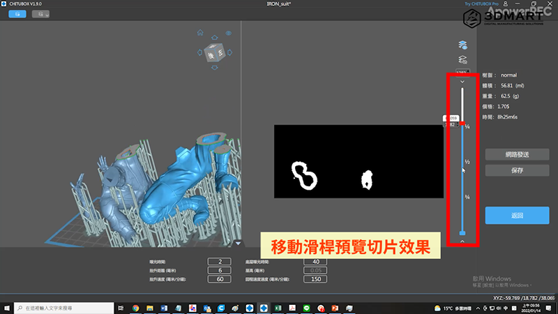 最後點選「切片」即可獲得模型切片檔,軟體運算後會顯示詳細內(nèi)容,包含材料樹脂類型、列印時間;將檔案存入USB後上傳至機器,在Phrozen Sonic Mini 8K內(nèi)讀取後開始列印。