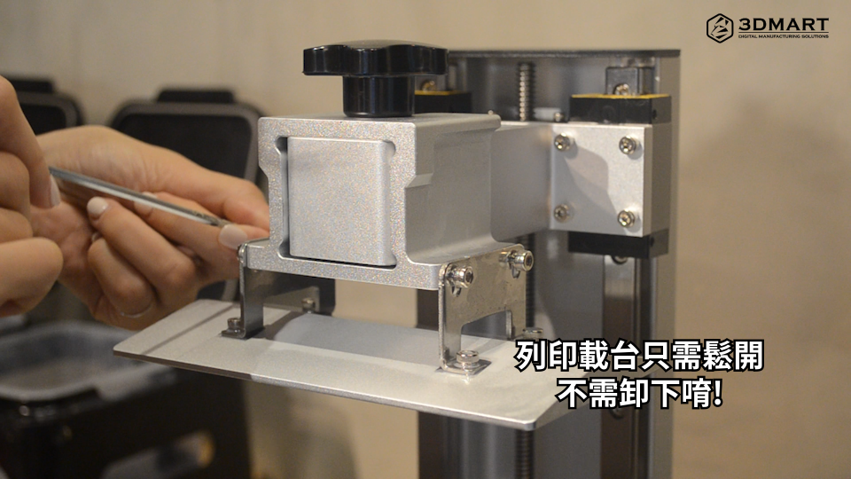 將樹脂槽卸下,並將列印載臺左右固定螺絲鬆開(載臺不需卸下)