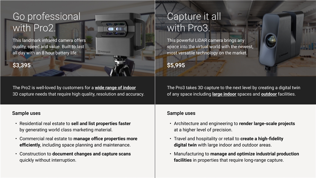 Matterport在去年年底前推出新產品Pro3後,他們?yōu)榭蛻籼峁┝烁噙x擇,讓客戶可以根據需求選擇最適需求環(huán)景空間3D掃描設備。選擇合適的相機並不是都要是最高解析度或最新功能。對於專業(yè)環(huán)景空間3D掃描,在Pro2和Pro3之間進行抉擇通常取決於使用項目和價格。