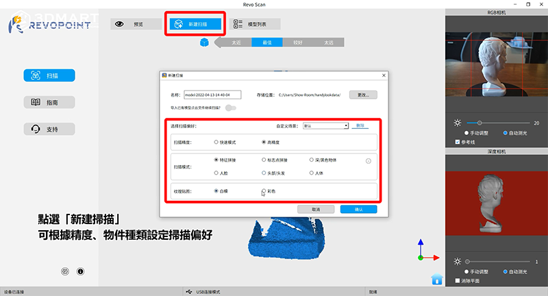2. 點(diǎn)選「新建掃描」可以根據(jù)精度、物件種類設(shè)定掃描偏好