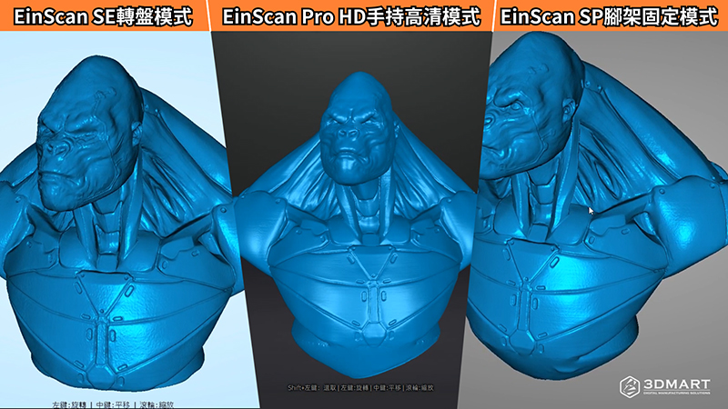 「EinScan Pro HD」擁有手持式高清掃描、固定轉(zhuǎn)盤式兩種掃描功能,解析度再進(jìn)階!適合工業(yè)性能、掃描大型物件,應(yīng)用空間廣泛;「EinScan SE」、「EinScan SP」掃瞄範(fàn)圍雖然相較有限,但非常適合掃描體積小的物件,綜合價(jià)錢、效能來(lái)說(shuō),CP值非常劃算!