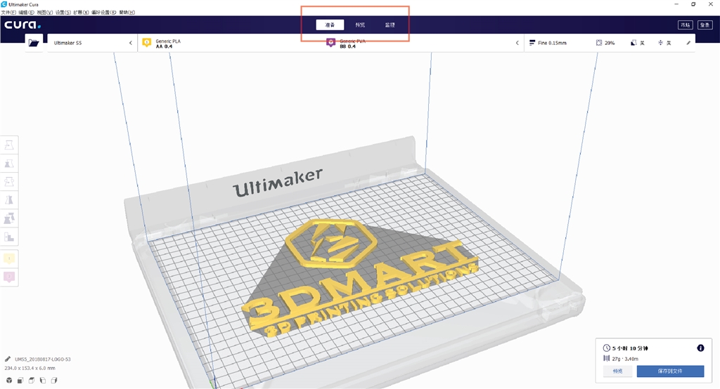 Ultimaker Cura中新的使用界面更加適應(yīng)各類型用戶,舊版的控制區(qū)改為顯示在上方;在「準(zhǔn)備」區(qū)塊可以看到3D模型外觀,模擬3D列印過(guò)程的「分層視圖」及「預(yù)覽視圖」則移至「預(yù)覽」區(qū)塊,「監(jiān)視」區(qū)則可以監(jiān)控Ultimaker列印機(jī)的列印進(jìn)度。