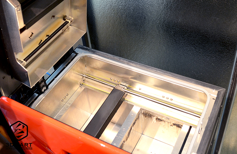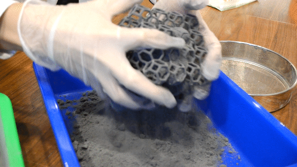 右邊的列印平臺(tái)無須填入粉末,會(huì)在機(jī)器封閉進(jìn)行3D列印時(shí)會(huì)透過左邊的進(jìn)粉槽逐層覆蓋;填充完成後,只要按照Sinterit Lisa的指示步驟開始列印就會(huì)自動(dòng)完成囉!完成並開啟後,3D列印粉末及成品都會(huì)跑到右邊的列印平臺(tái),平臺(tái)會(huì)將列印完成的粉末塊推升,用專用刮勺整塊剷起即可。