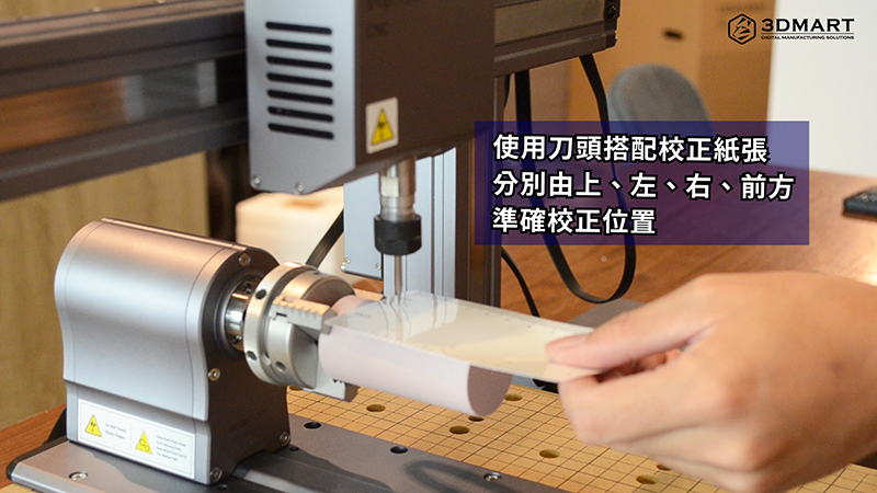 校正主要是透過刀頭、校正紙張(內(nèi)附),分別由材料上、左、右、前四個方向,進行準確位置校正,點選螢幕上的箭頭按鈕,即可即時控制刀頭方向;完成校正後,安裝旋轉(zhuǎn)軸尾座,設(shè)備前置作業(yè)就完成了!