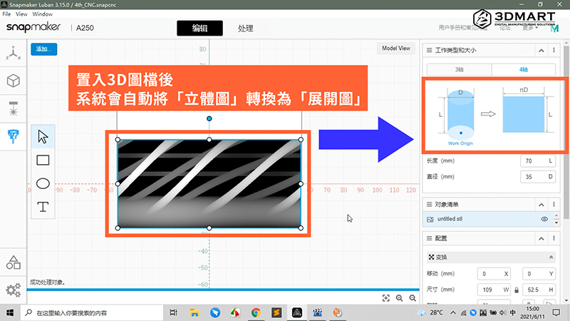 3D圖檔置入軟體後,系統(tǒng)會自動將「3D立體」轉(zhuǎn)換為「平面展開圖」,再將展開圖與材料預覽區(qū)對齊。