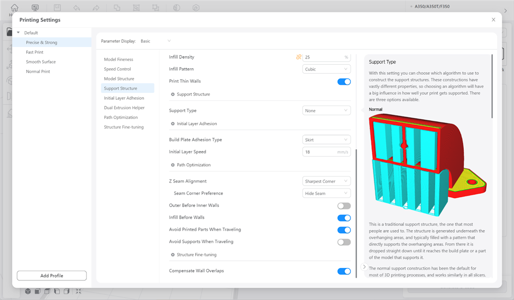 在4.4.0版本中,多達290個材料與3D列印參數(shù)可以調(diào)整,對比以前版本只有50多個參數(shù)可調(diào)整,本次更新是非常大的優(yōu)化!您可以存取這些基礎參數(shù),甚至完全控制列印過程,以下提供可調(diào)整的參數(shù)樣本: