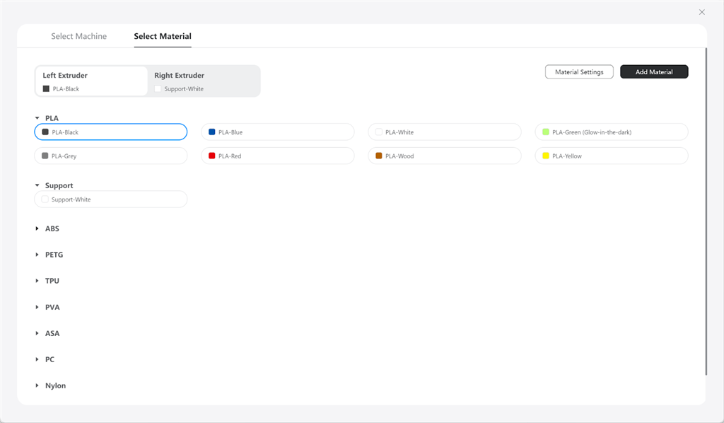 從右上角的工具欄點擊進入材料選擇,進入會看到清楚詳細的材料介面,從基本到專業(yè)的都有,包含PVA、HIPS、Breakaway材料等等。以及即將要推出雙噴頭3D列印可支持的尼龍(Nylon)。