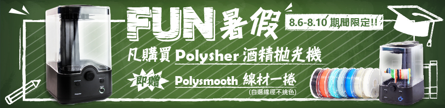 【好康速報】暑期限定最優(yōu)惠!8/6-8/10買拋光機送線材! 3DMart 陪你歡樂FUN暑假!凡於8/6到8/10期間限定,購買Polysher 酒精拋光機即贈PolySmooth線材一捲(顏色隨機、可選線徑)! 原價1580元,買到賺到、做夢會笑;沒有學(xué)生證、沒有暑假也沒關(guān)係,趕緊看準日期下單,同樣享優(yōu)惠! PolySmooth是一款可被酒精拋光的新材料,列印條件幾乎和PLA一模一樣,容易列印、極低翹曲率、良好的強度及支撐易拆除,而且搭配Polysher酒精蒸氣拋光機,能讓你創(chuàng)造光滑的表面質(zhì)感;輕鬆後加工、完工及成品!別說小編沒提醒你,拋光機輕鬆讓你的成品高貴不貴,時間一到速速開搶?。?! 貼心附上懶人連結(jié):http://www.yztcys.cn/products/polymaker-polysher