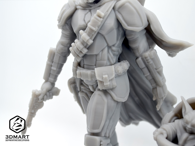 3D列印完成後,高達(dá)20cm的「曼達(dá)洛人」連同支撐結(jié)構(gòu)一起誕生了!使用超音波切割刀將支撐拆除後,可以更清楚的看到從身上的盔甲、披肩、武器槍械、子彈背帶,到手臂衣料、手指紋路的各種高精度細(xì)節(jié),效果非常細(xì)緻驚豔!