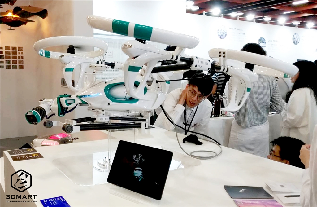 工業(yè)設(shè)計類有許多突破性的成果,這臺超越觀賞模型、真實可動的四軸飛行器,除了前方攝影鏡頭可像機(jī)械手臂一樣360度無限旋轉(zhuǎn)外,因為動能太強(qiáng),甚至差點「掙脫」固定架在展場內(nèi)直接起飛。