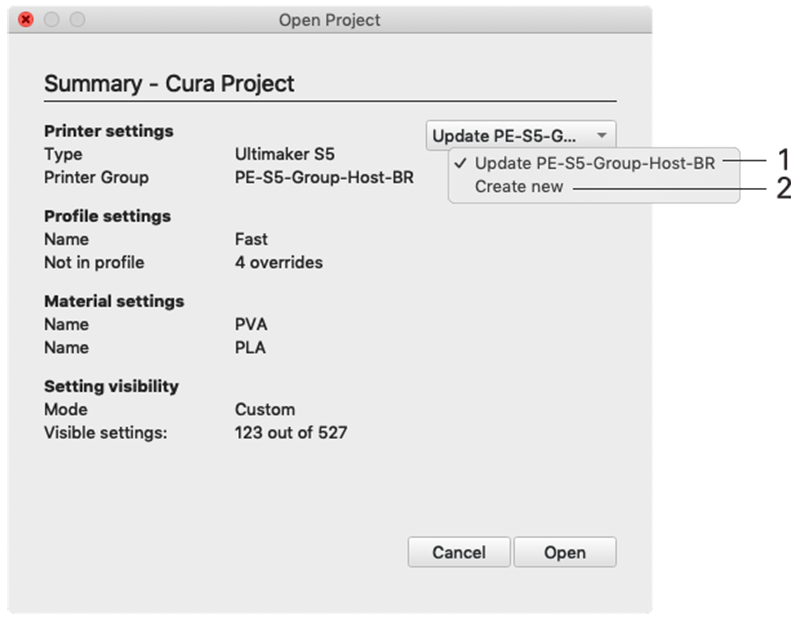 開啟檔案項目時,Ultimaker Cura提供置入整個項目文件,或置入其中一個模型的選項。