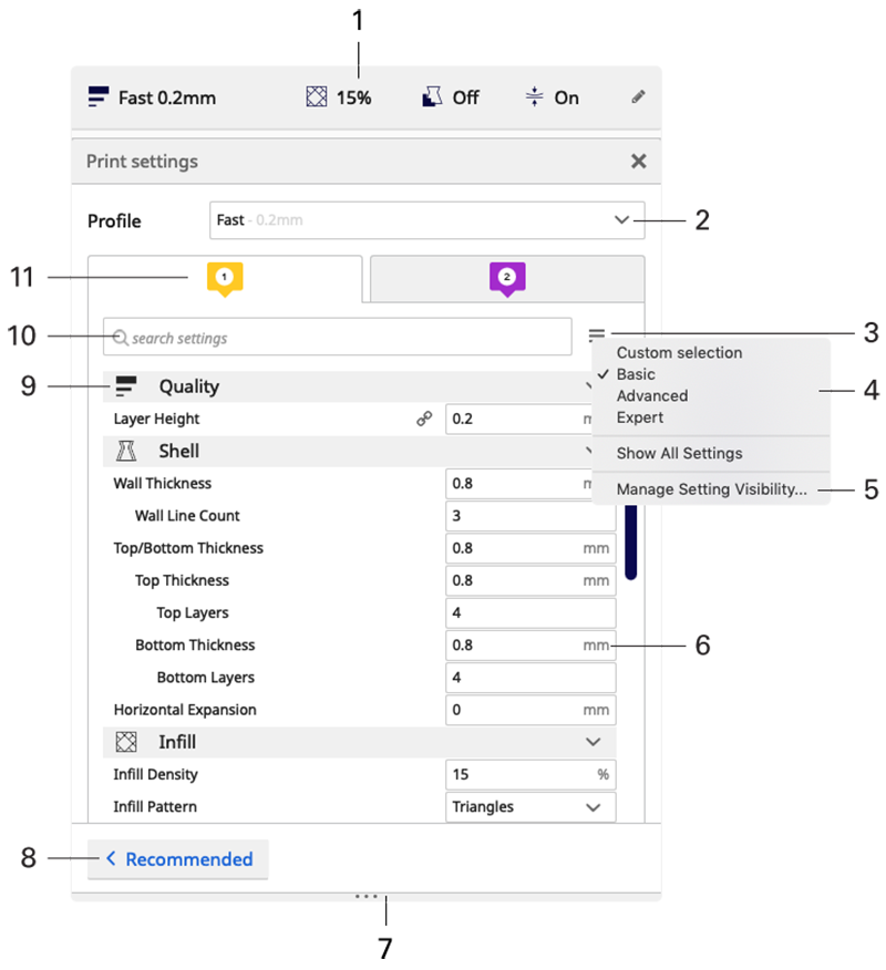 Ultimaker Cura的設定面板中有推薦與自訂模式,推薦模式適用於初學者,而自訂模式能為有經(jīng)驗的用戶提供更多的設定。