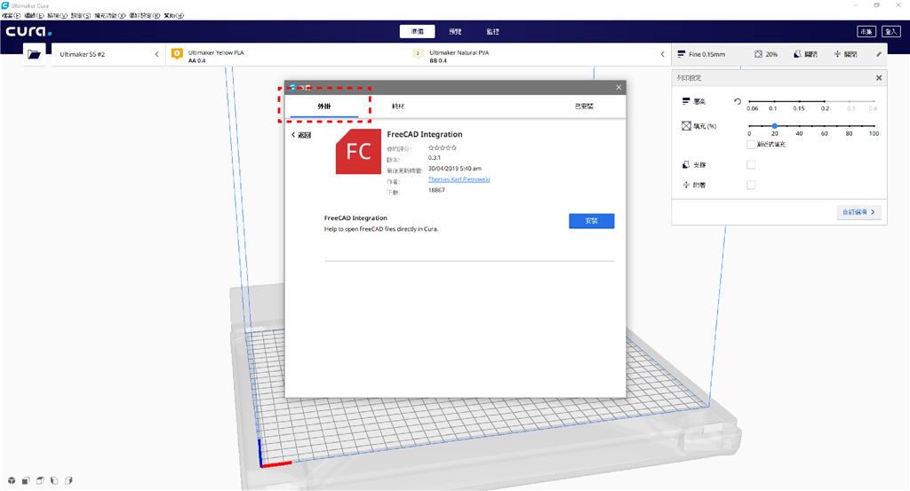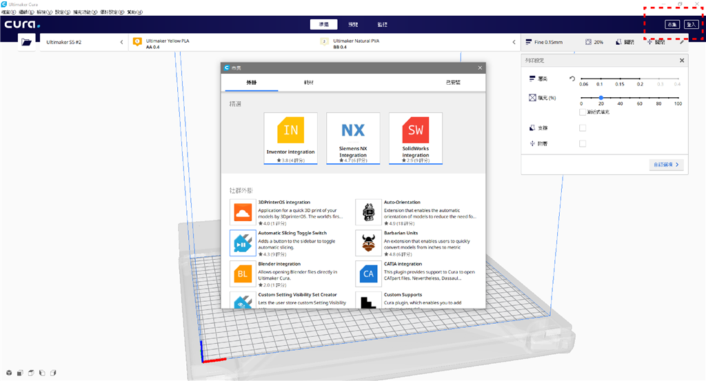 各式軟體外掛能依需求提供個人化調(diào)整,例如:有些外掛能銜接CAD和Ultimaker Cura,方便工程師、設(shè)計師直接將3D圖檔進行列印切片、讓步驟更簡單。Ultimaker也貼心的意識到,下載及安裝是初學者常見的入門障礙,因此新版的Cura中已經(jīng)整合這些功能,打開Cura後就能在介面的右上角找到。