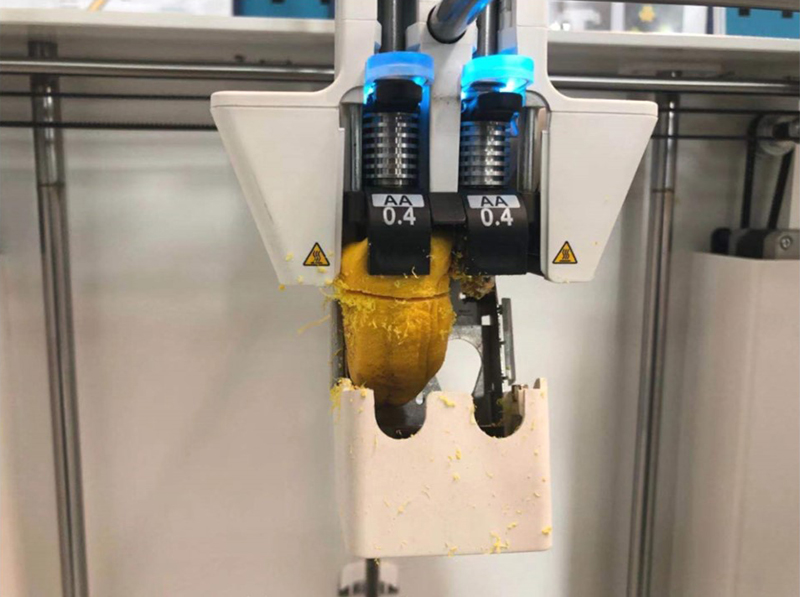 使用受潮的3D列印線材進(jìn)行3D列印,材料經(jīng)過噴頭溶解擠出後,因?yàn)槌睗穸鵁o法順利附著在工作平臺(tái)上,反倒堆積在噴頭中;如果剛好沒有及時(shí)發(fā)現(xiàn),材料會(huì)持續(xù)堆積形成一整塊塑料,冷卻後會(huì)非常難清潔、甚至造成破壞性的損壞。