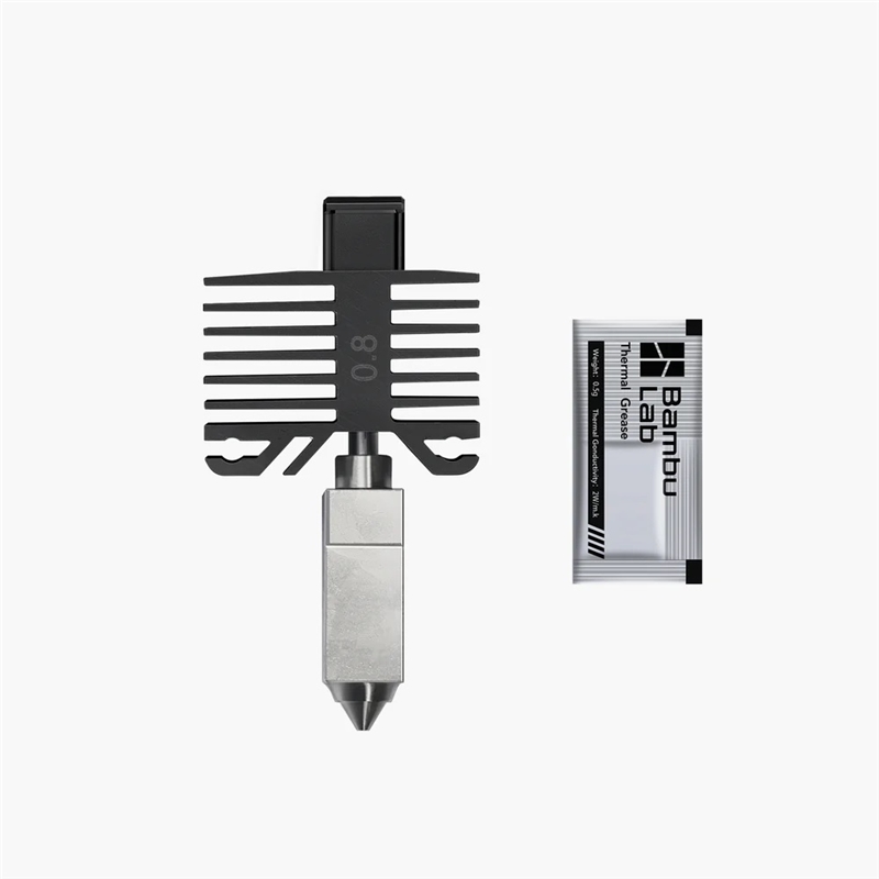 帶不鏽鋼噴嘴的熱端組件採用的一體成形設(shè)計(jì)。僅適用於Bambu Lab 3D列印機(jī)。噴嘴集成到模組中,並透過細(xì)金屬連接到散熱器,已獲得最佳性能。有了這種設(shè)計(jì),模組的加熱速度會比普通的模組快得多,而且一體成形設(shè)計(jì)有效地減少更換噴嘴可能的問題。散熱片採用高導(dǎo)熱鋁合金,喉部採用TC4鈦合金。噴嘴由銅合金和不鏽鋼組合製成,在保證硬度的同時可大流量列印。