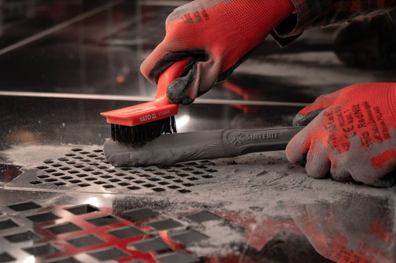 位於工作臺的大孔蓋中,將未燒結的粉末倒入,也能同時清潔列印物件,進行第一步篩粉,多餘的粉末會從孔洞中流入下方密閉空間,只留下上方待清潔的列印成品。