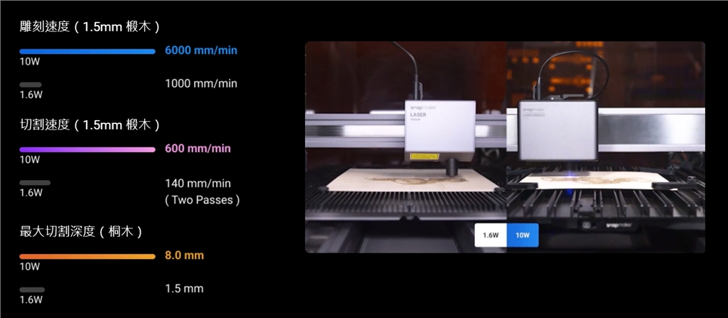 10W雷射模組單次切割厚度可達(dá)8mm,雕刻速度可達(dá) 6,000mm/min。相較於1.6W雷射模組,其切割速度可達(dá) 8 倍。從這個(gè)角度來(lái)看,切割速度是1.6W 激光模塊的8倍!