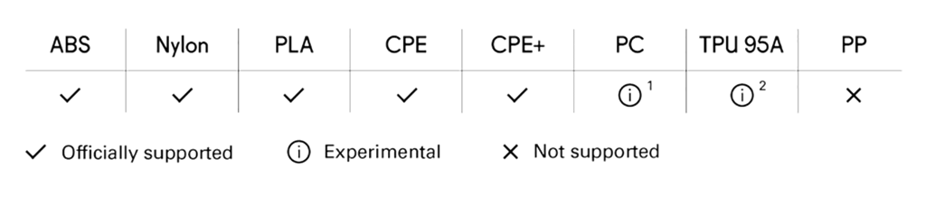 (*)表示這些組合僅在安裝加熱床升級時以實驗性方式使用。