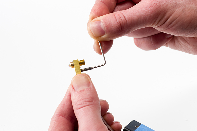 - 使用六角扳手插入加熱端隔離器的孔中,逆時(shí)針旋轉(zhuǎn)將噴頭從熱端隔離器(如下圖所示的金屬部件)鬆開(kāi)。通過(guò)這種方式,將噴嘴取下。